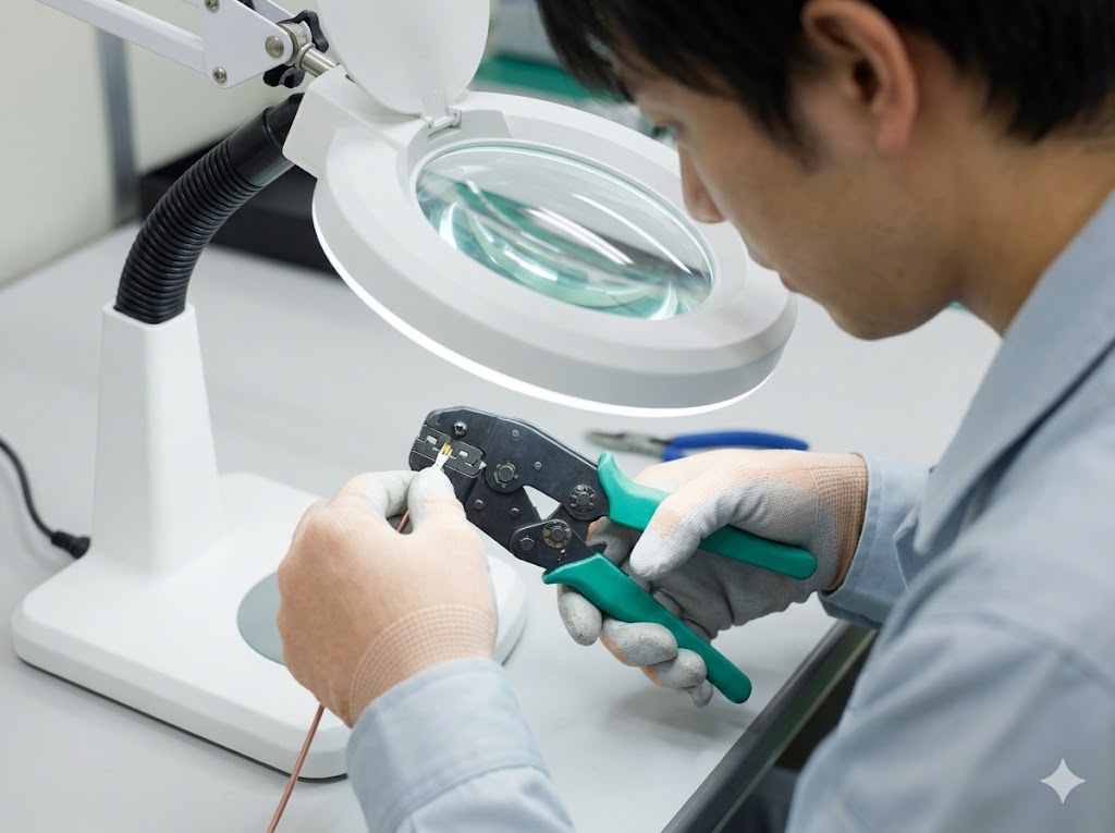 エンジンルームの奥深くや、ダッシュボード裏の狭いスペースで配線を修理しなければならない時、手元でルーペを見ながら精密圧着を行うのは物理的に不可能です。