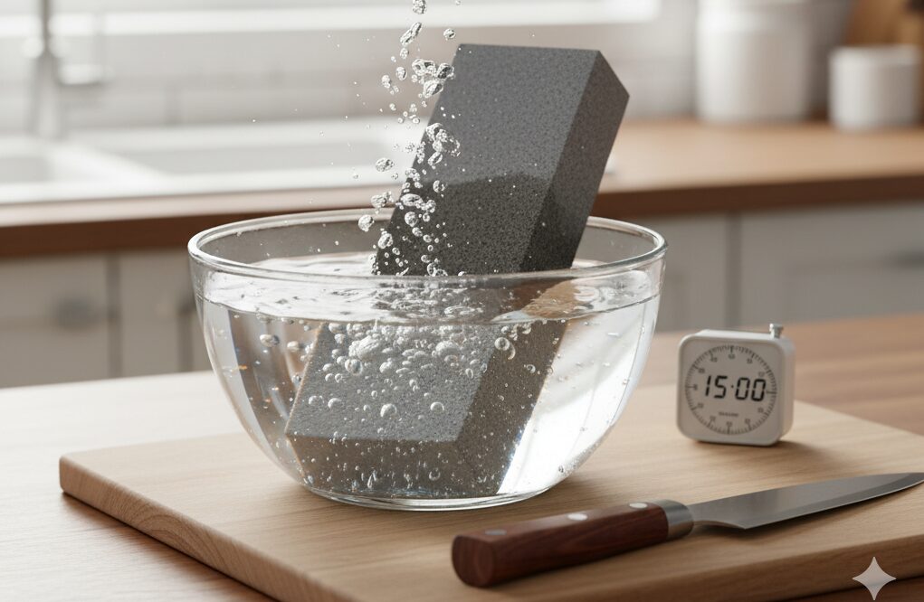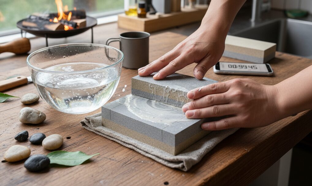 まず、砥石を水に浸けます。目安は気泡が出なくなるまで(約10分〜20分)です。しっかり吸水させないと、研磨がスムーズに進みません。
