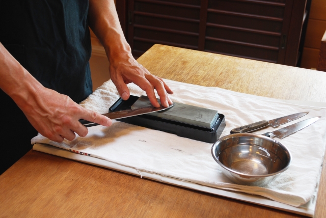 必ず濡れた布巾や専用の砥石台の上に置き、しっかりと固定します。