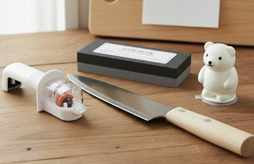 ワッツやキャンドゥで扱われていることがある「包丁研ぎ 吸盤タイプ しろくま」や類似品がおすすめです。テーブルに吸盤で固定できるため、本体を手で押さえる必要がありません。片手でサッと研げる手軽さと、使わない時もホコリを防げるデザイン性の高さが魅力です。切れ味も「1回目でスパッと切れた」とあり、簡易研ぎ器としての性能は十分です。