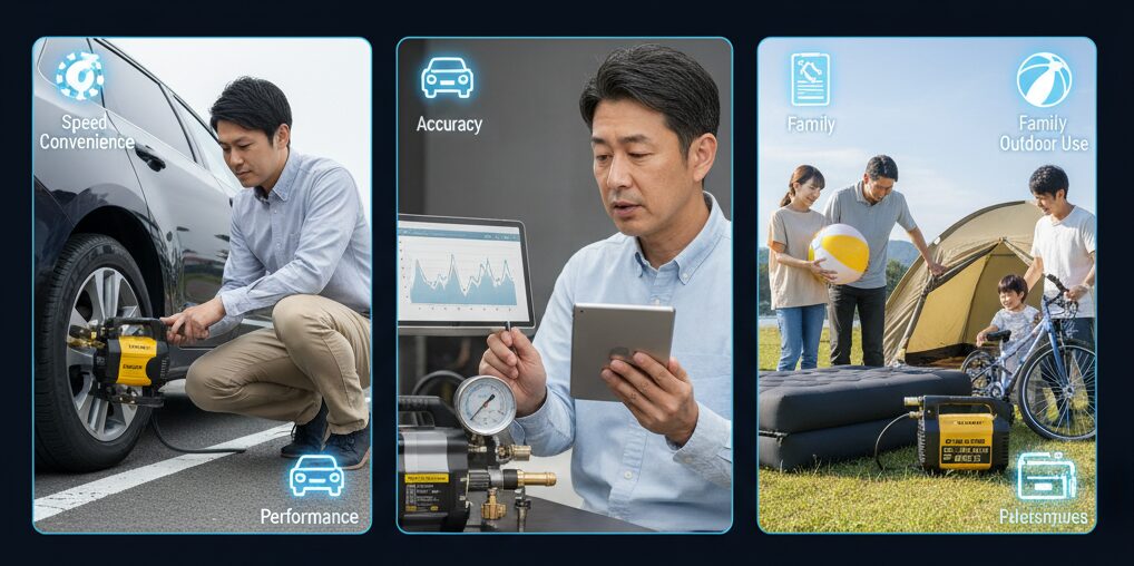 - 車用エアコンプレッサーは電源方式と充填速度で選ぶのが基本
