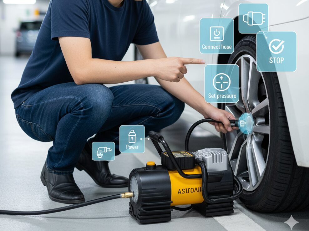 AstroAIの電動エアコンプレッサーは、直感的な操作性が魅力で、説明書を熟読しなくても簡単に使えます。ここでは、シガーソケット給電タイプの基本的な使い方を紹介します。