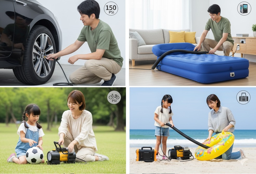 「5 in 1」モデルは、「車のメンテナンスだけでなく、キャンプや海水浴などのレジャーでも使いたい」というファミリー層やアウトドア愛好家に特におすすめです。一家に一台あれば、あらゆる空気入れの場面で活躍してくれるでしょう。