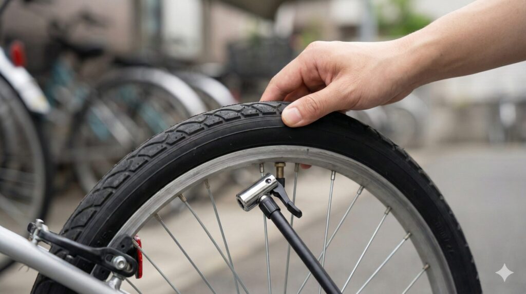 一つ目は、デジタル表示を無視して感覚で入れる方法です。オートストップ機能は使えないと割り切り、数秒充填してはタイヤを指で強く押し、その硬さ(反発具合)で適正かどうかを判断します。これはアナログですが、英式バルブにおいては最も確実な手法です。