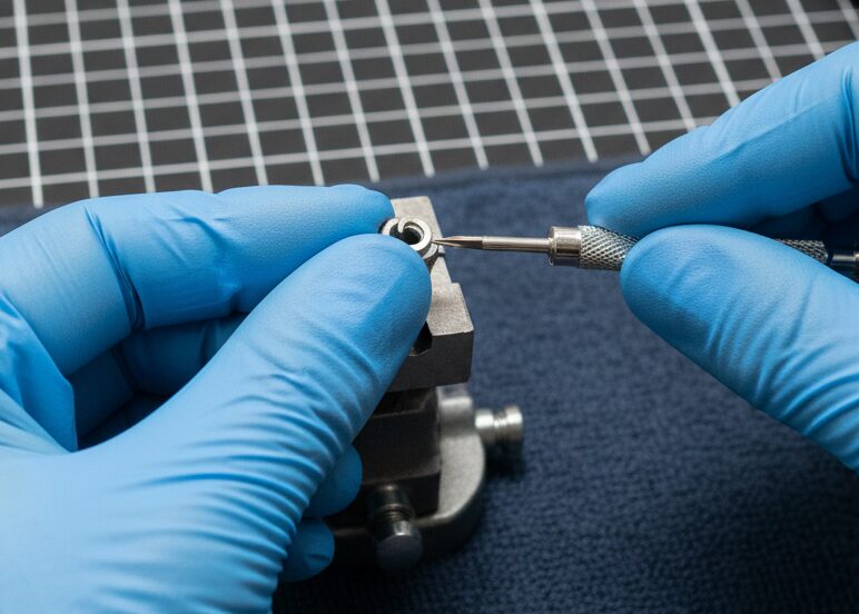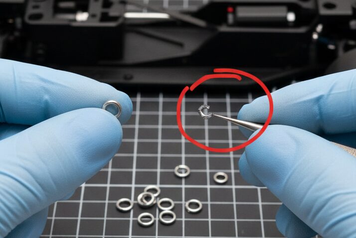 リングの片側が溝から完全に外れたら、そこを起点に指や精密なピンセットでしっかりと掴み、シャフトから水平に引き抜きます。最後の瞬間まで気を抜かず、リングが飛ばないように意識を集中させましょう。
