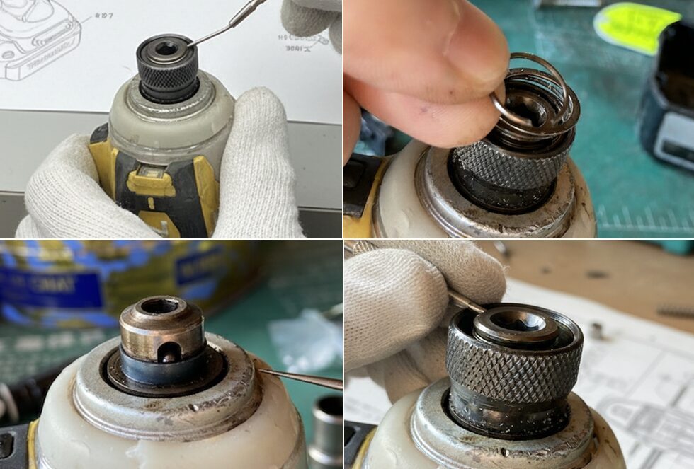 ここでは、スチールボールを交換するための、インパクトドライバー先端部分の具体的な分解・組立手順を解説します。作業自体は比較的単純ですが、部品が非常に小さく、特にバネ類は飛び跳ねて紛失しやすいため、慎重に進めてください。